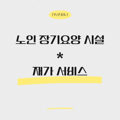| 내용 | 노인요양시설 또는 노인용양 공동생활 가정에 장기간 입소한 수급자에게 신체활동 지원 및 심신 기능의 유지향상을 위한 교육 훈련 등 제공 | *가정에 거주하는 수급자에게 제공 -방문요양, 방문목욕, 방문간호 -주.야간보호, 단기 보호 -복지용구 구입, 대여 |